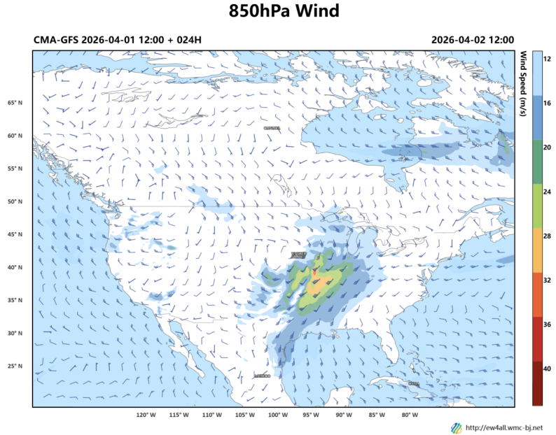 图1 2026年4月2日12时(世界时)850hPa风场(风羽,单位:m/s)预报