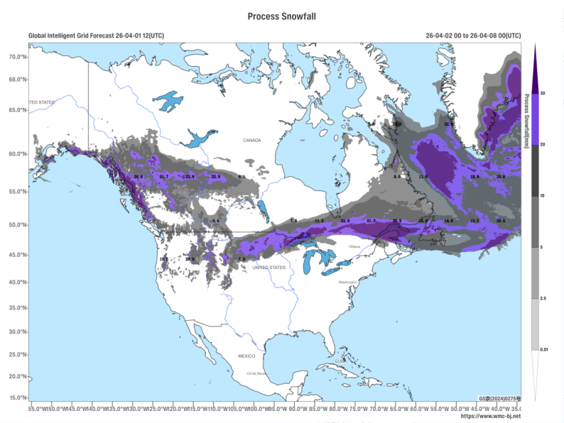 预计4月2-7日,受爆发性气旋影响(图1),加拿大西部和南部、美国西北部高海拔地区和中部偏北地区有大到暴雪,其中,加拿大魁北克省南部和安大略省南部、纽芬兰岛、美国北达科他州南部和明尼苏达州北部等地部分地区有大暴雪到特大暴雪;上述地区过程累计降雪量10~25毫米,部分地区30~50毫米(图2);上述地区还将有5~7级风、阵风8~9级,江河湖面阵风10级以上(图3)。需关注暴风雪天气对交通运输、能源保供等行业带来的不利影响。
