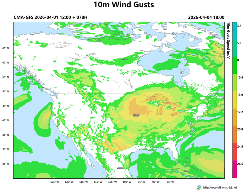 图3 2026年4月3日18时至4日18时(世界时)最大阵风风速预报(填色为4级以上大风,单位:m/s)