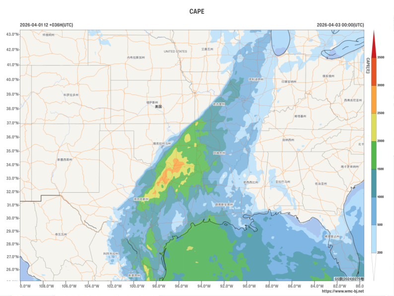图4 2026年4月3日00时(世界时)对流有效位能预报(填色,单位:J/kg)