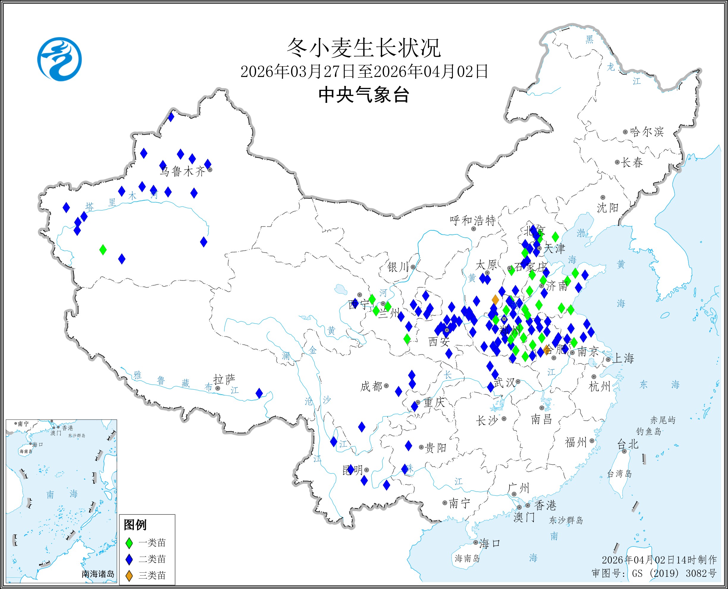 预计未来10天(4月2-11日),冬小麦产区气温较常年偏高1~4℃,西北地区东部、华北、黄淮等地大部降水稀少,土壤墒情适宜,水热条件总体利于北方冬小麦拔节生长和孕穗;江淮、江汉、四川盆地东部等地降水量有10~50毫米、部分地区50~100毫米,降水利于土壤增墒,但部分地区降水偏多不利小麦抽穗开花,同时田间湿度大也易诱发条锈病、赤霉病等病害发生发展。