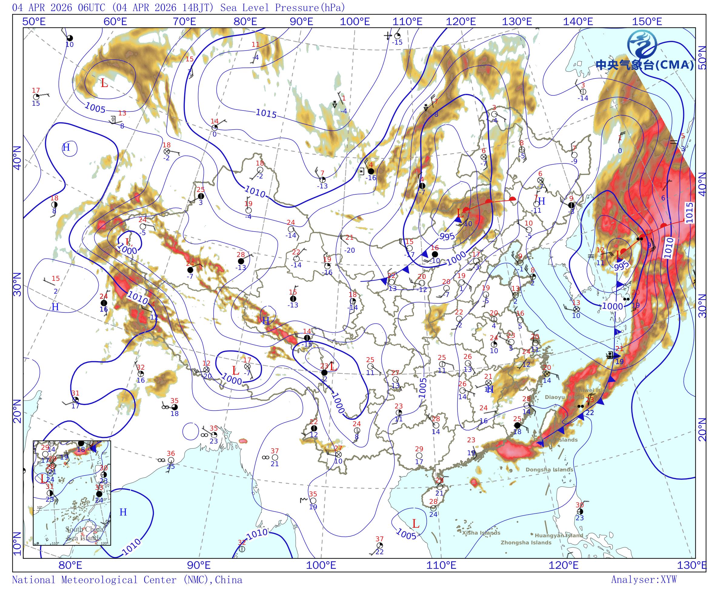 站点的填图要素包括:云量、风向风速、天气现象、温度(红色数字)和露点(蓝色数字);天气系统符号包括:高压中心(H)、低压中心(L)、冷锋(带三角形蓝色线段)、暖锋(带半圆形红色线段)和台风符号;蓝色等值线为海平面气压场等压线(单位hPa);底层填色为地形高度;顶层填色为红外卫星云图。