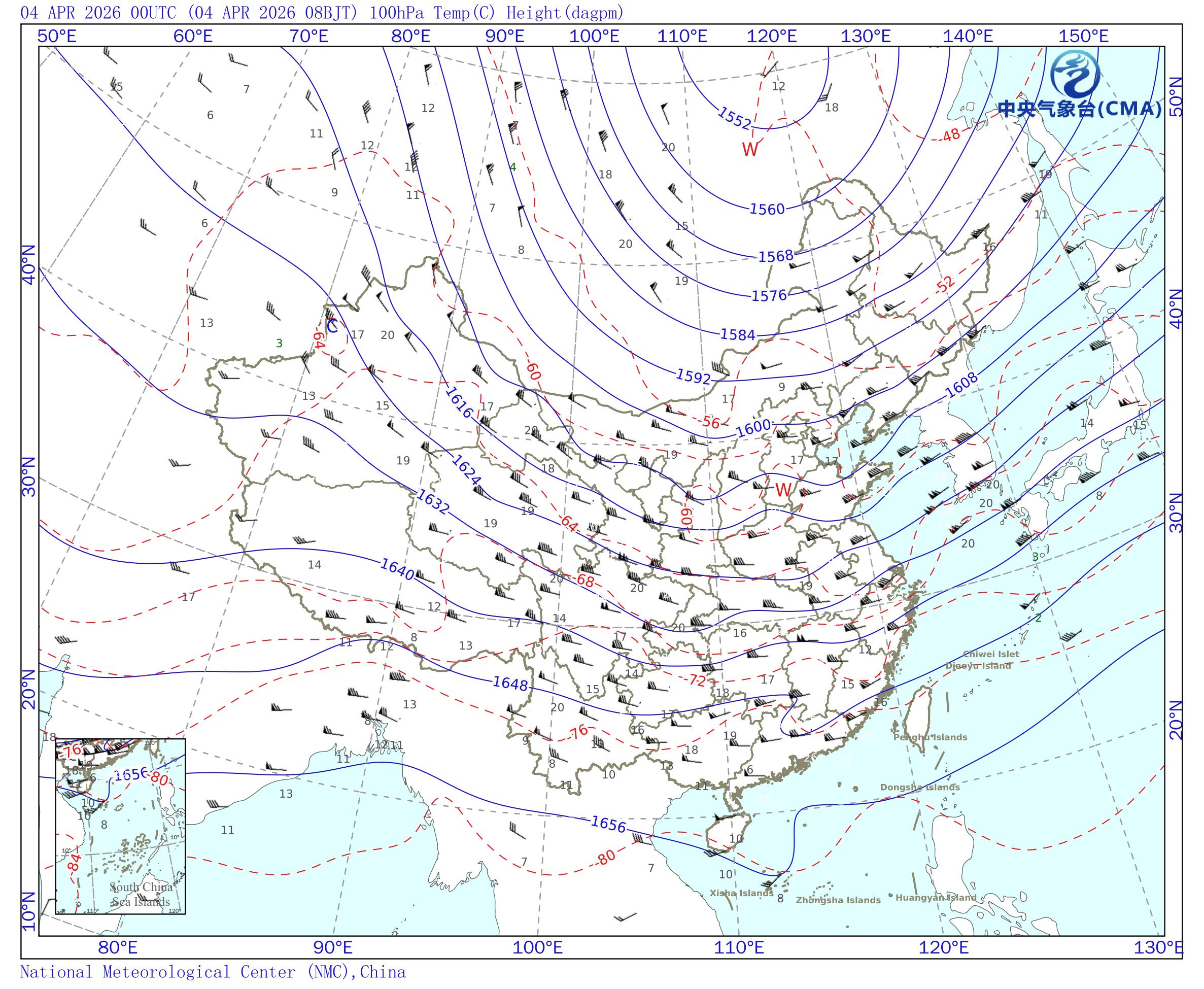 站点的填图要素包括:风向风速和温度露点差;天气系统符号包括:高压中心(H)、低压中心(L)、暖中心(W)、冷中心(C)和台风符号;蓝色等值线为等高线(单位dagpm);红色等值线为等温线(单位℃),其中零摄氏度以下以虚线显示。