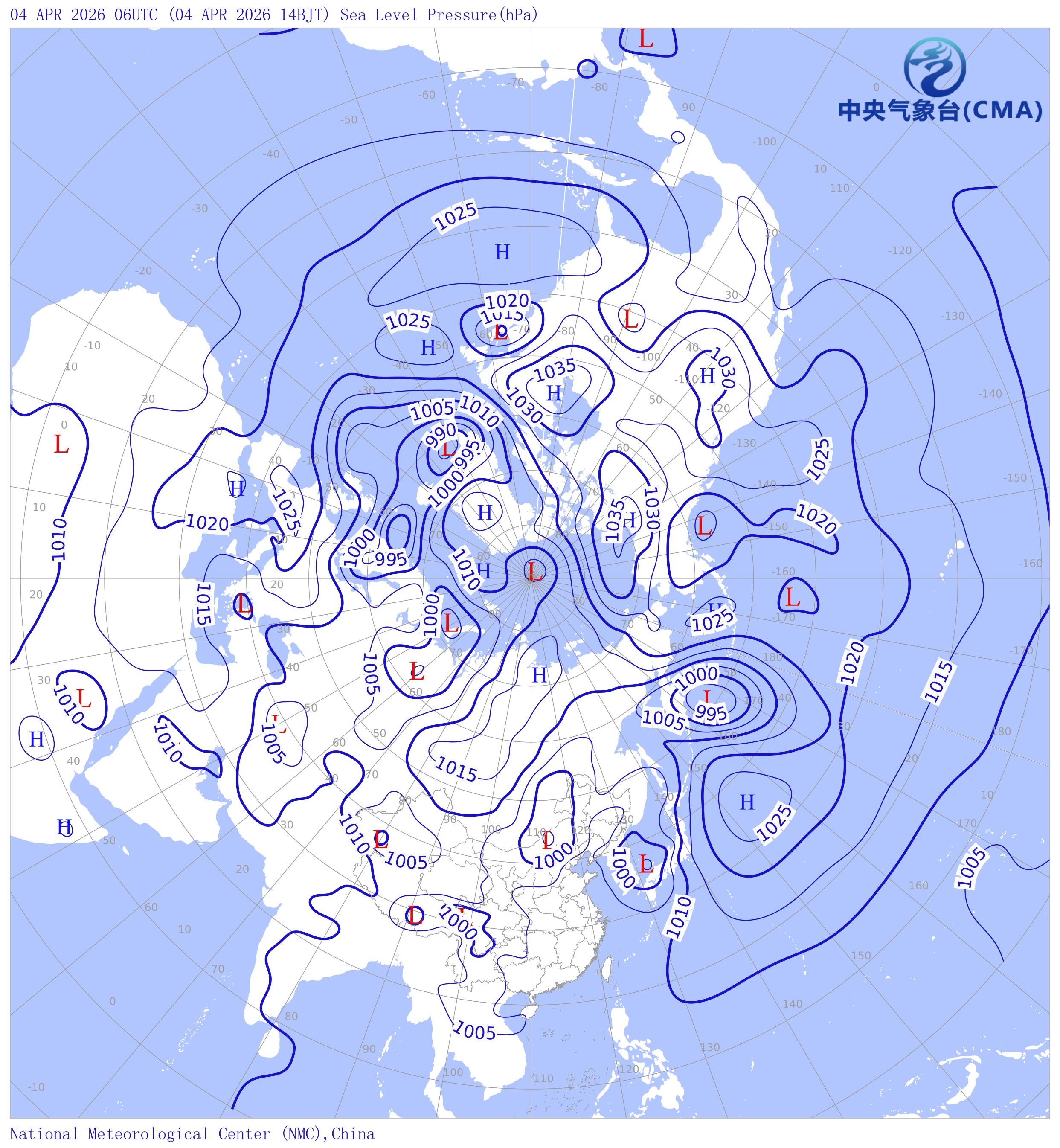 天气系统符号包括:高压中心(H)、低压中心(L)和台风符号;蓝色等值线为海平面气压场等压线(单位hPa)。