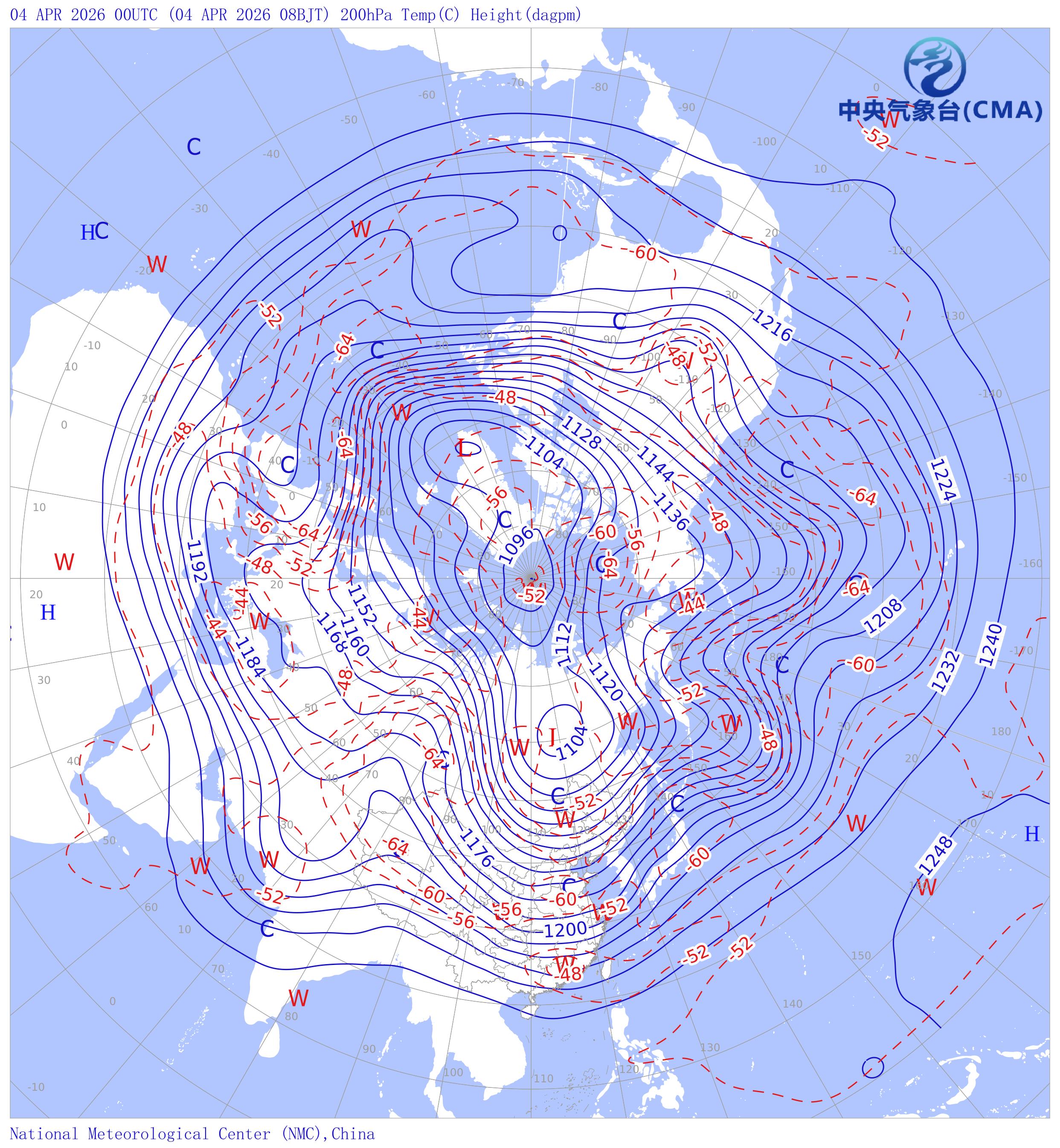 天气系统符号包括:高压中心(H)、低压中心(L)、暖中心(W)、冷中心(C)和台风符号;蓝色等值线为等高线(单位dagpm);红色等值线为等温线(单位℃),其中零摄氏度以下以虚线显示。