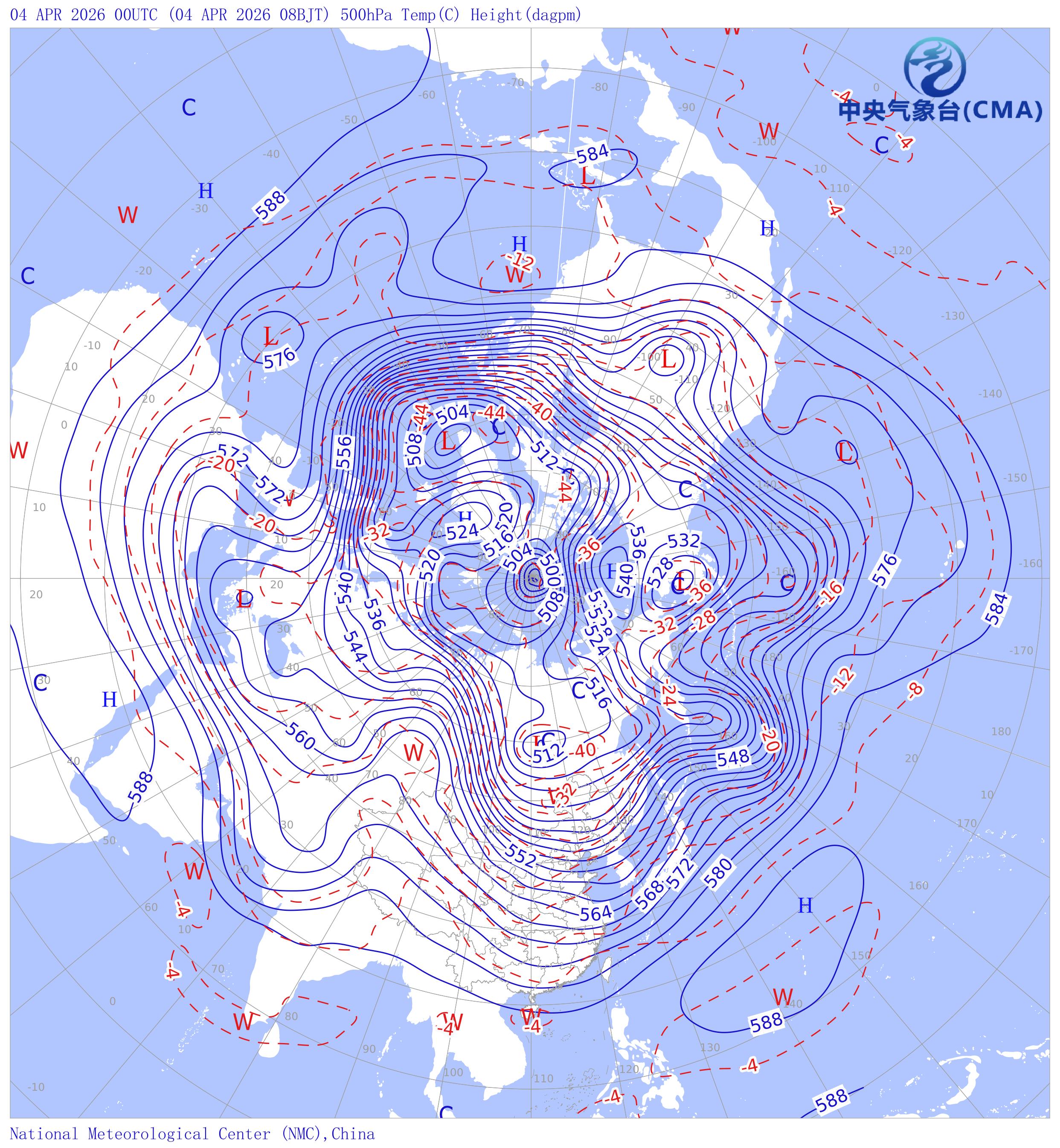 天气系统符号包括:高压中心(H)、低压中心(L)、暖中心(W)、冷中心(C)和台风符号;蓝色等值线为等高线(单位dagpm);红色等值线为等温线(单位℃),其中零摄氏度以下以虚线显示。
