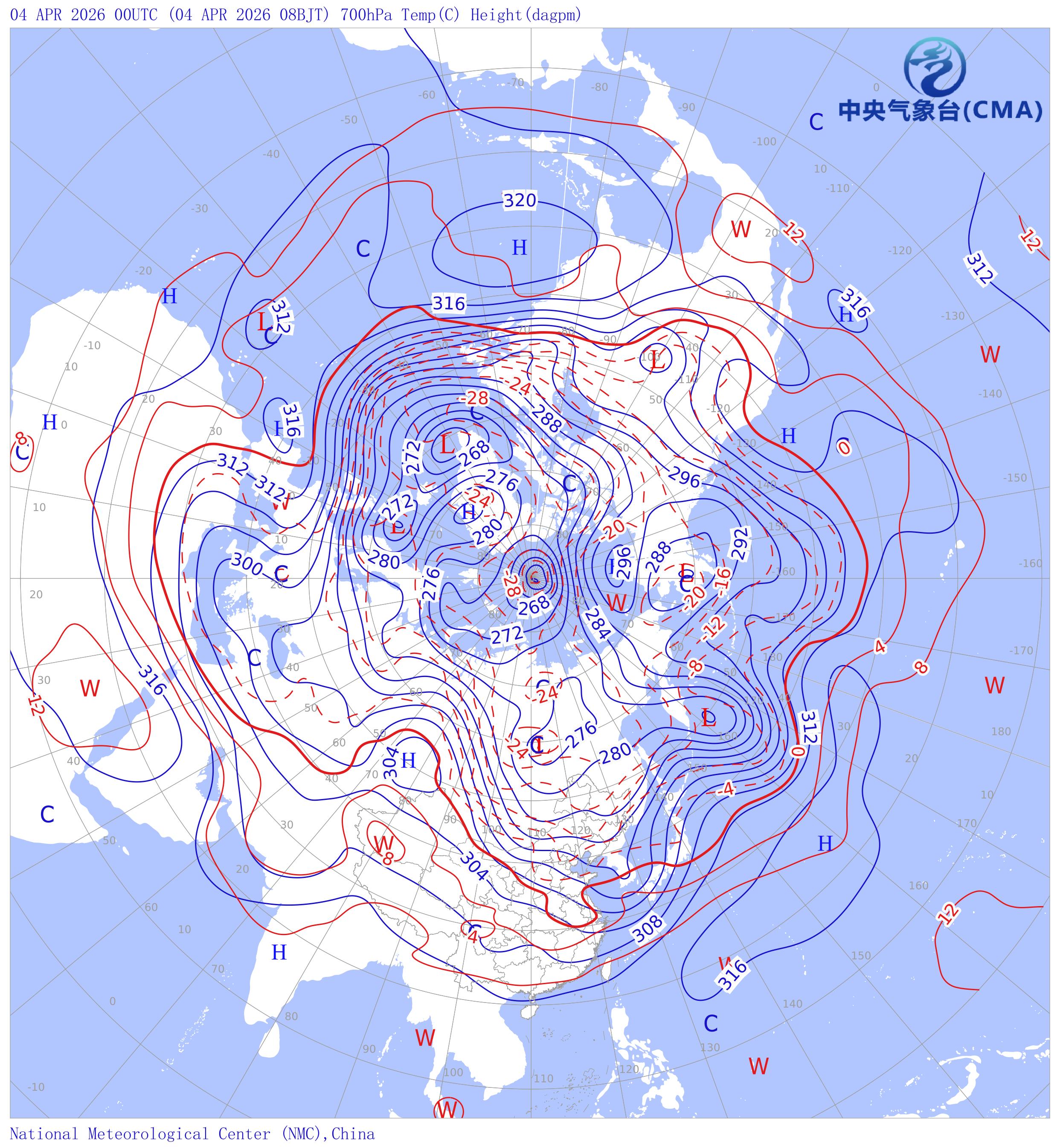 天气系统符号包括:高压中心(H)、低压中心(L)、暖中心(W)、冷中心(C)和台风符号;蓝色等值线为等高线(单位dagpm);红色等值线为等温线(单位℃),其中零摄氏度以下以虚线显示。