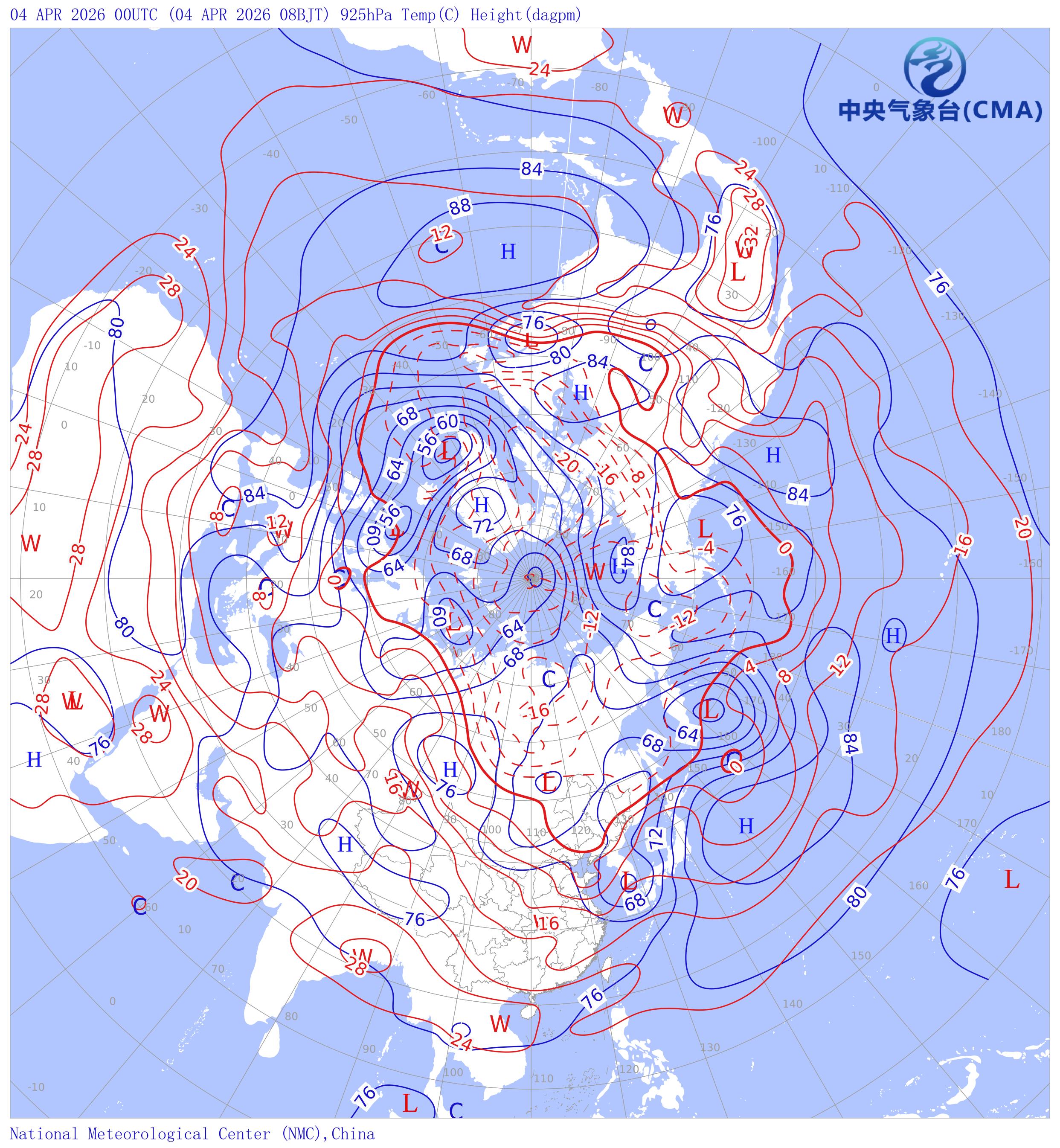 天气系统符号包括:高压中心(H)、低压中心(L)、暖中心(W)、冷中心(C)和台风符号;蓝色等值线为等高线(单位dagpm);红色等值线为等温线(单位℃),其中零摄氏度以下以虚线显示。
